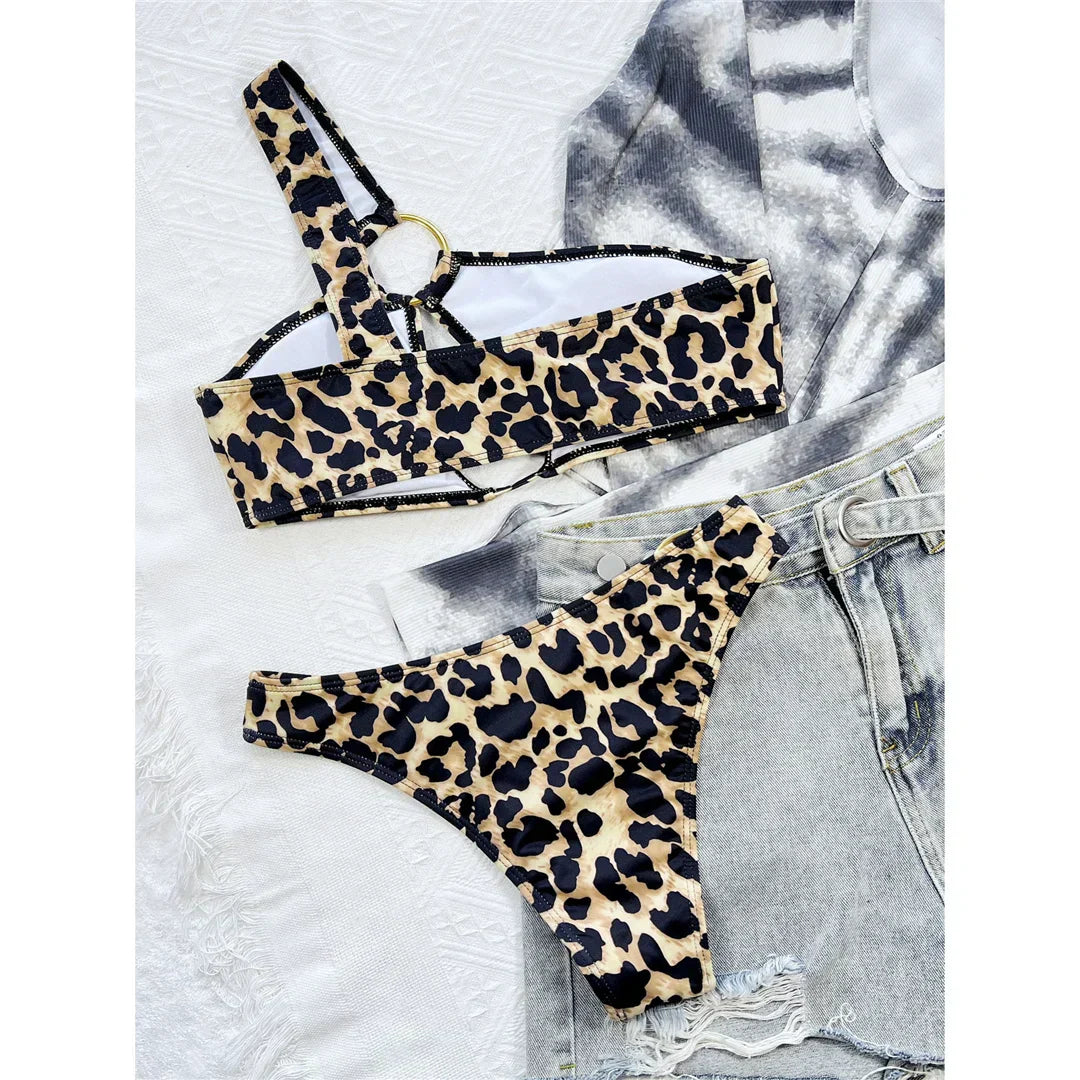 Two-piece leopard print swimsuit with an asymmetrical one-shoulder design.