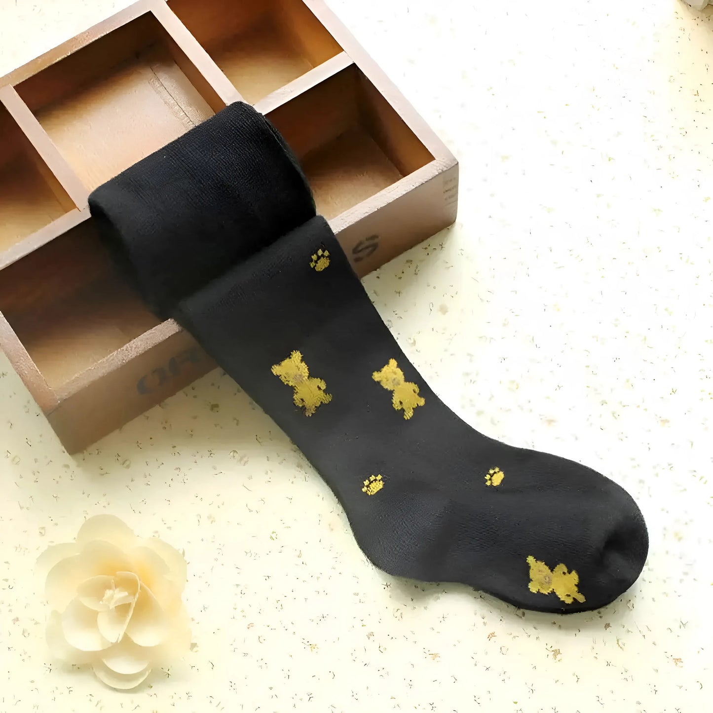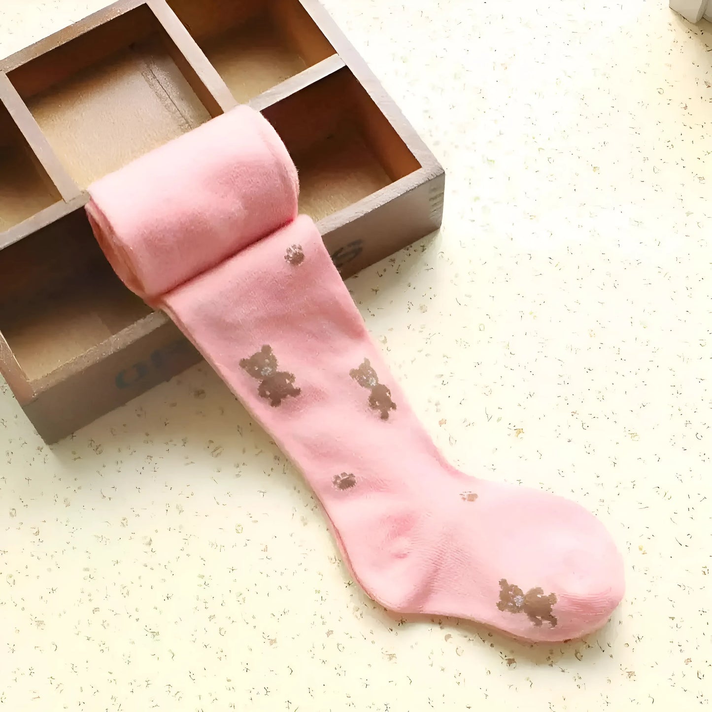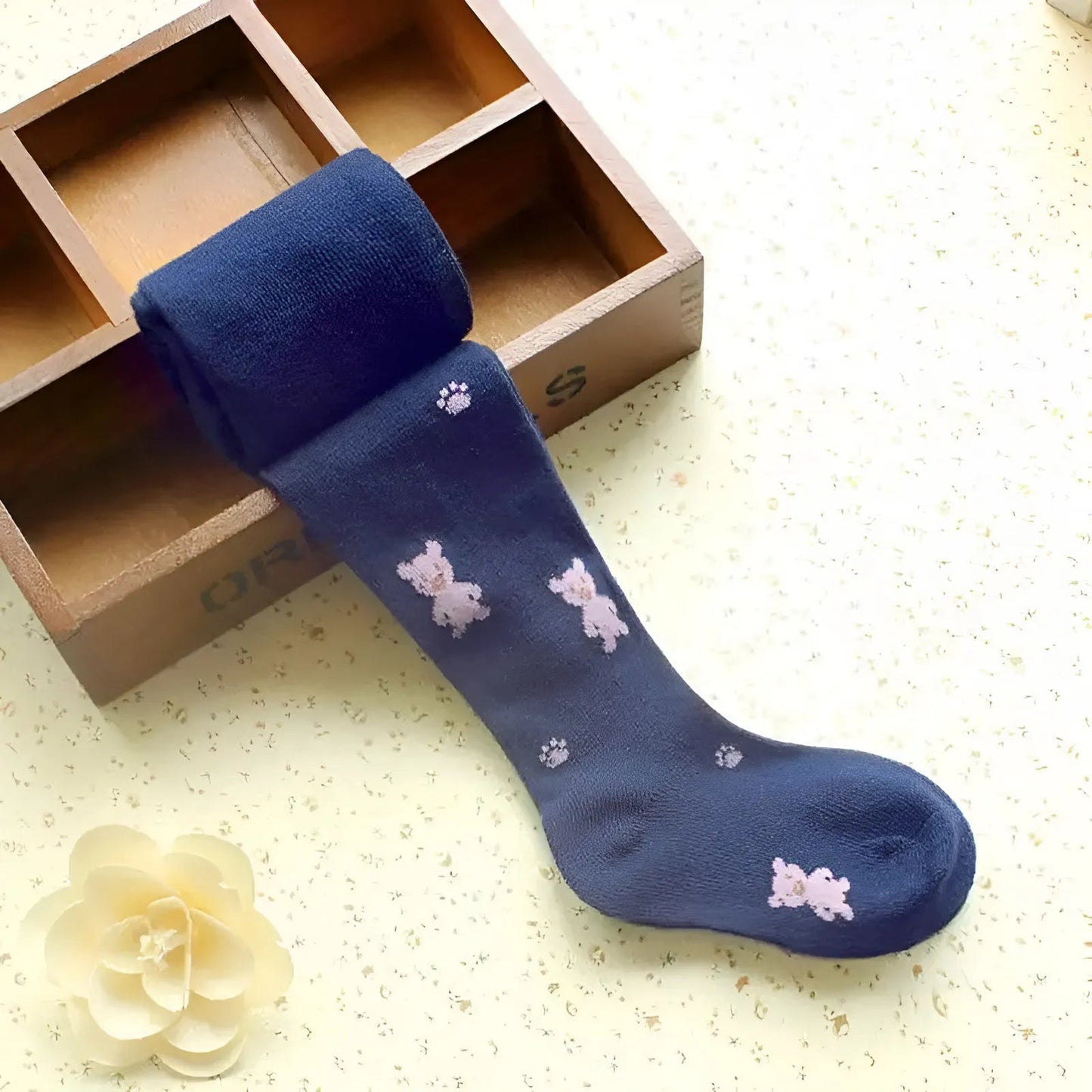 - Features children's tights with bear patterns.