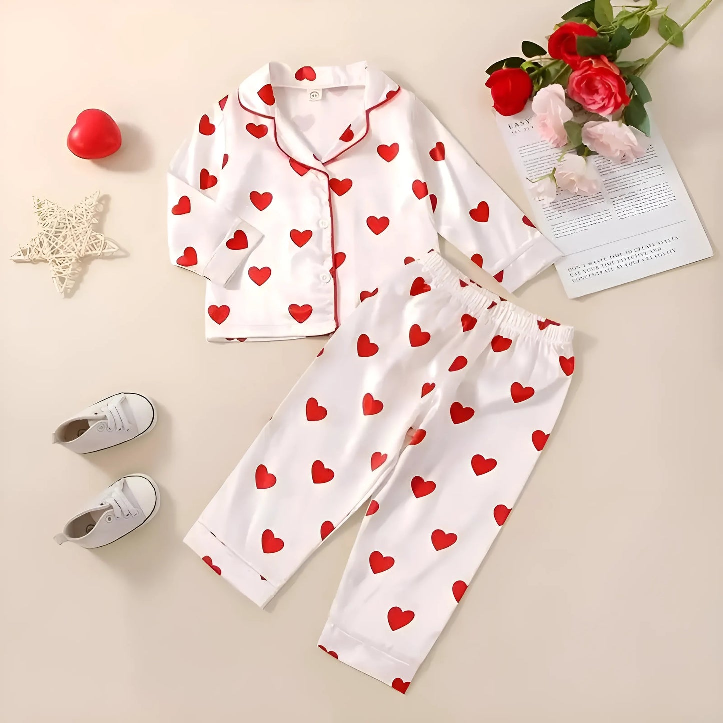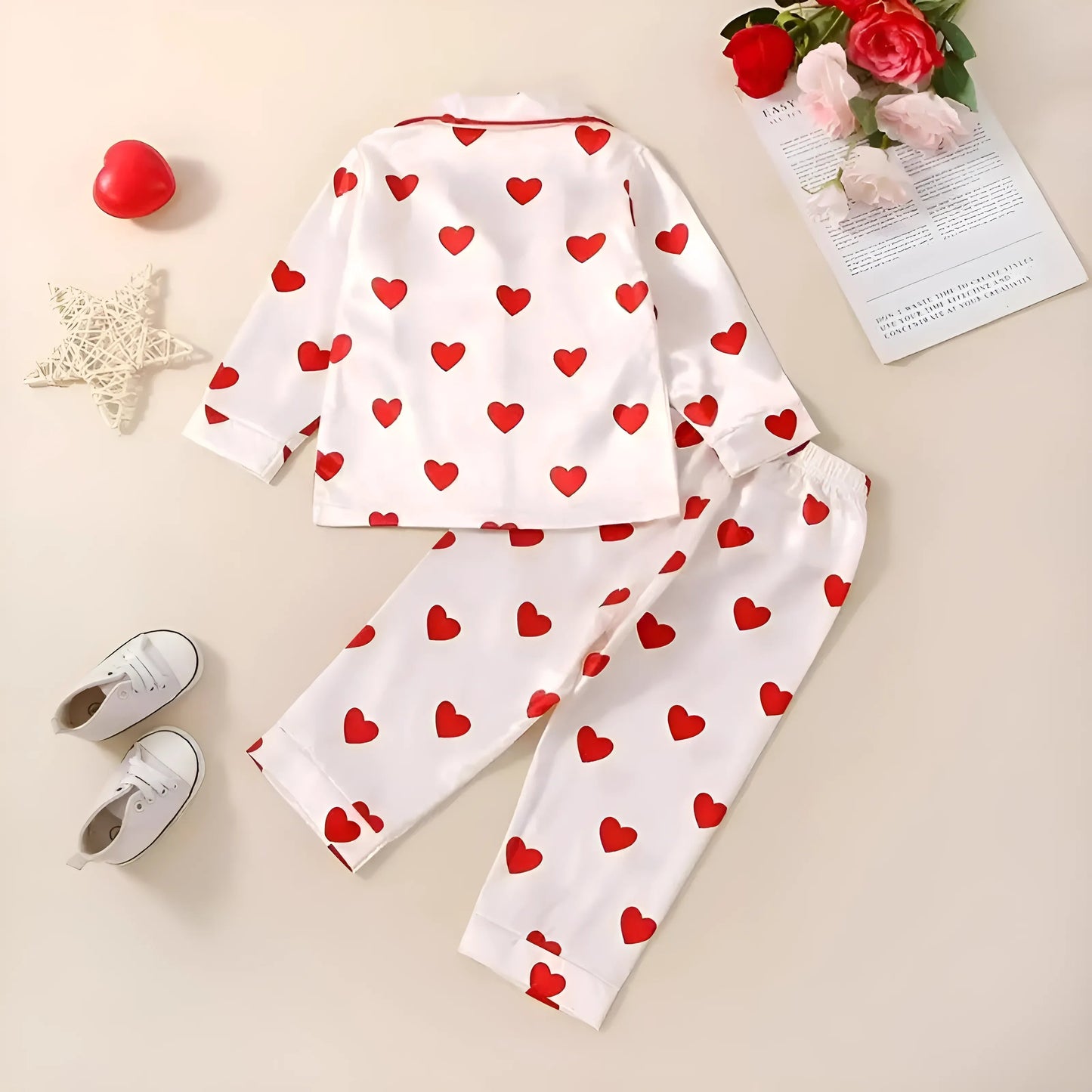- White pajama set with red heart pattern