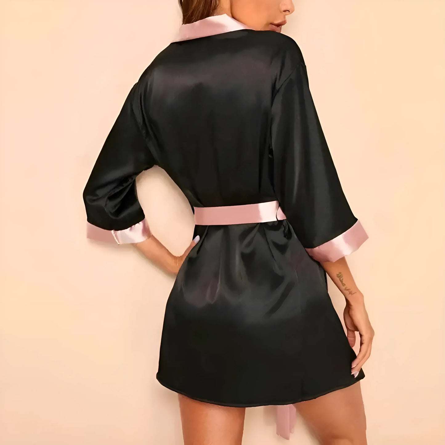 Wrap yourself in elegance with our stunning black robe, featuring a luxurious satin-like fabric and charming pink accents. Treat yourself to comfort and style—embrace your inner goddess today!