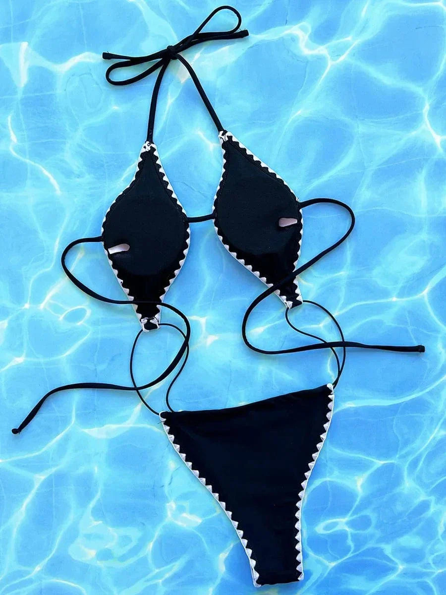 The neck and back ties allow for easy adjustment, while the teardrop-shaped cups subtly highlight the bust, creating a sensual effect. This swimsuit is the ideal option for women who want to feel confident and attractive.