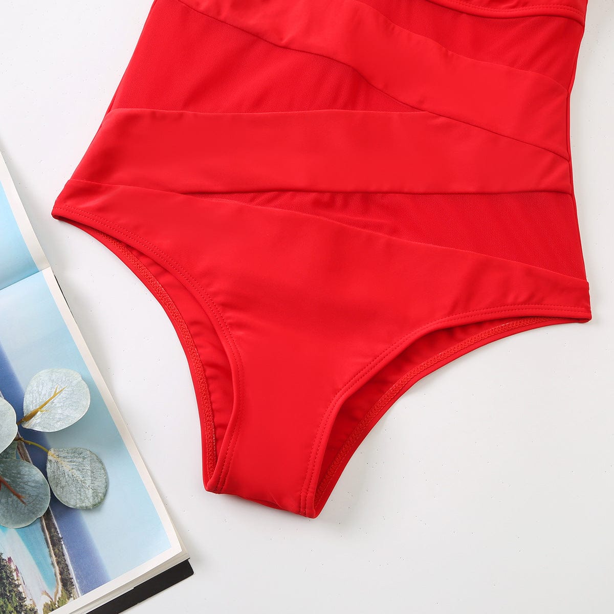 One-piece swimsuit with mesh.