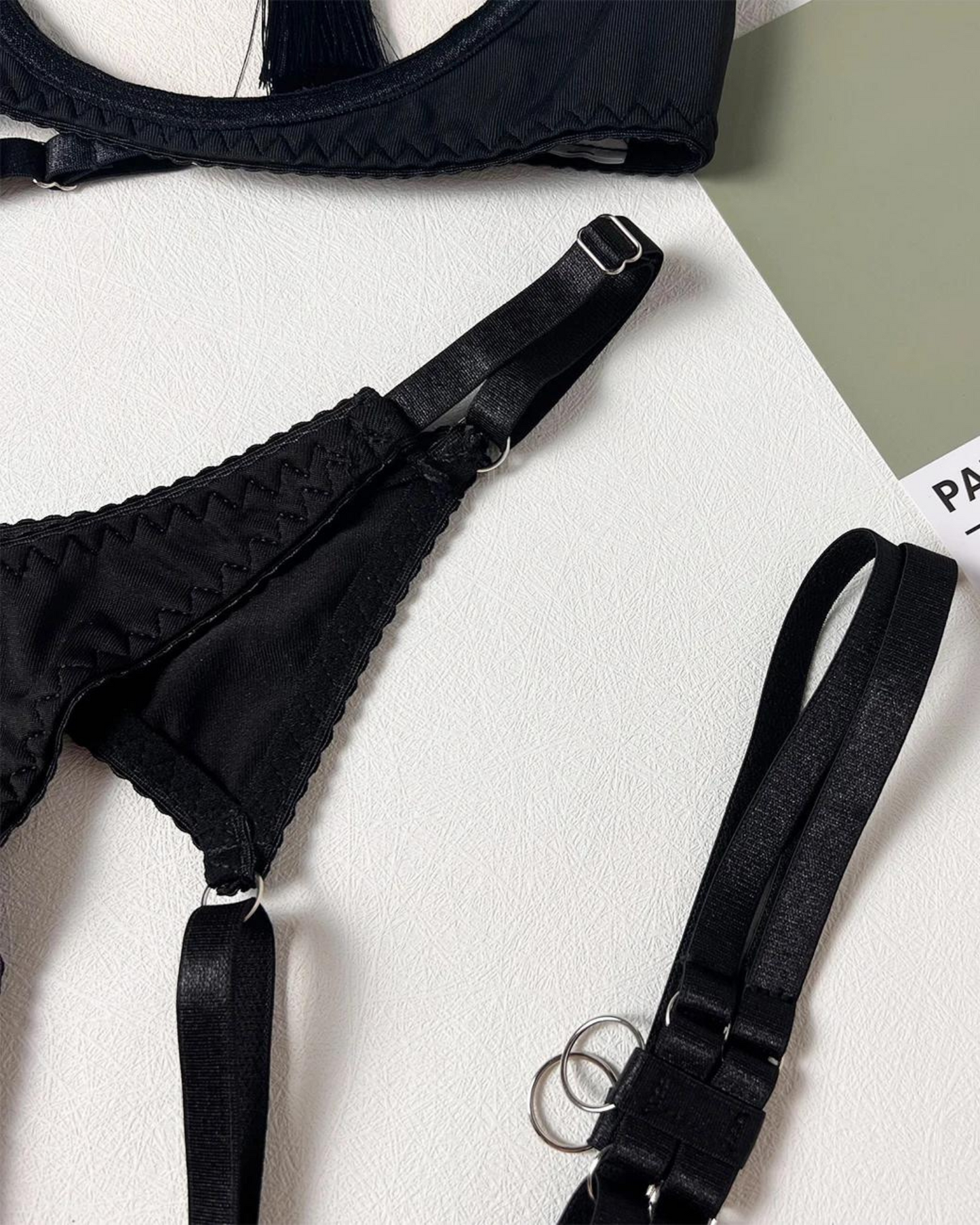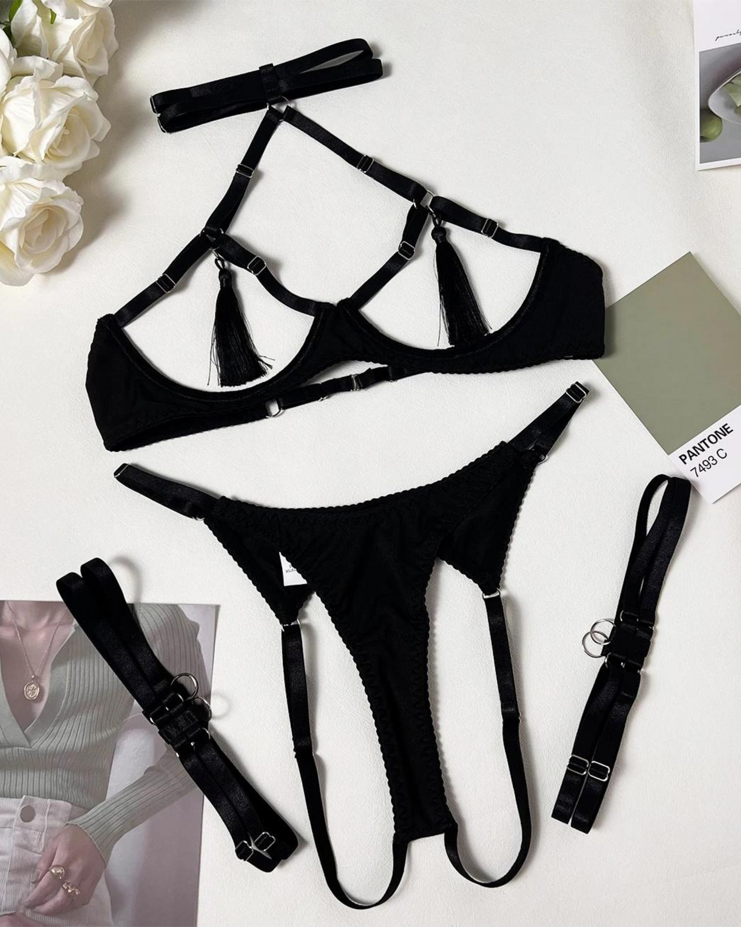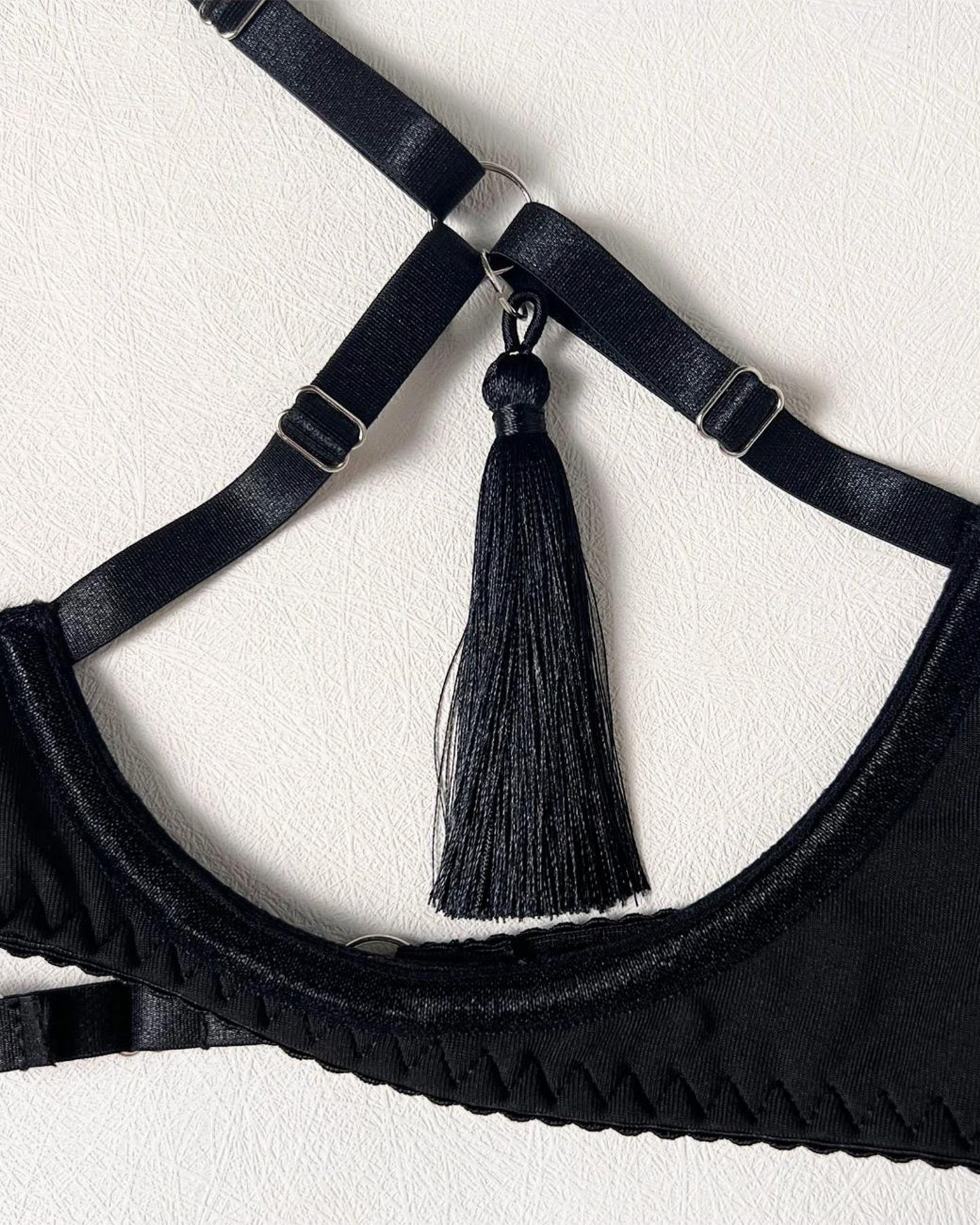 The bra features subtle tassels that gently fall over the nipples, along with adjustable straps, drawing attention and boldly showcasing the bust. The open design adds a touch of spice, making you feel alluring and confident.
