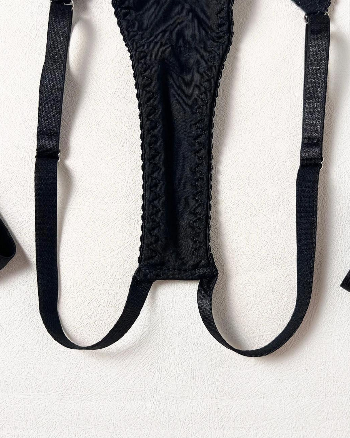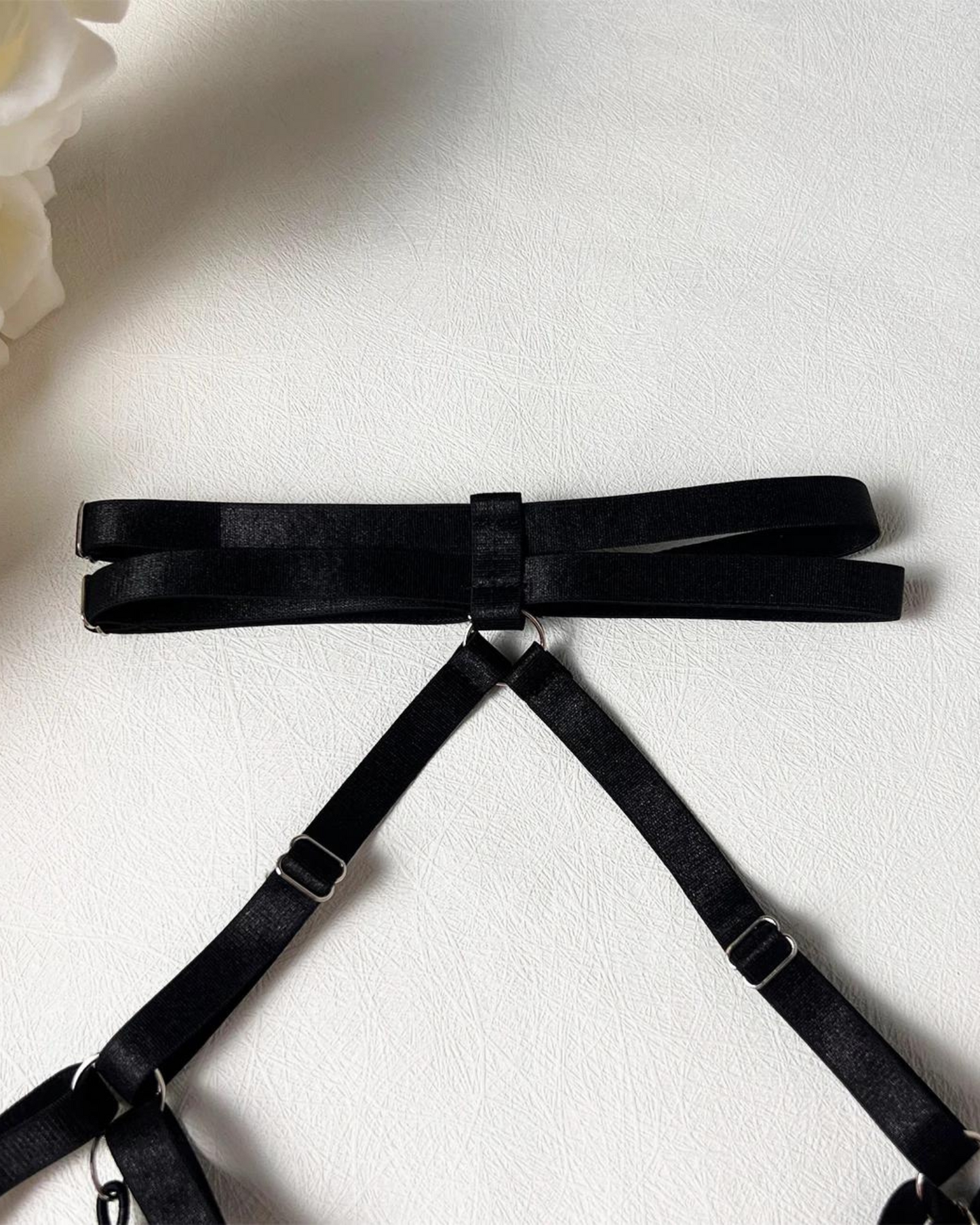 Enhance your lingerie collection with a sensual set that highlights your most beautiful assets. This unique ensemble consists of a daring bra, thong, and stylish thigh straps, creating the perfect combination of luxury and sensuality.