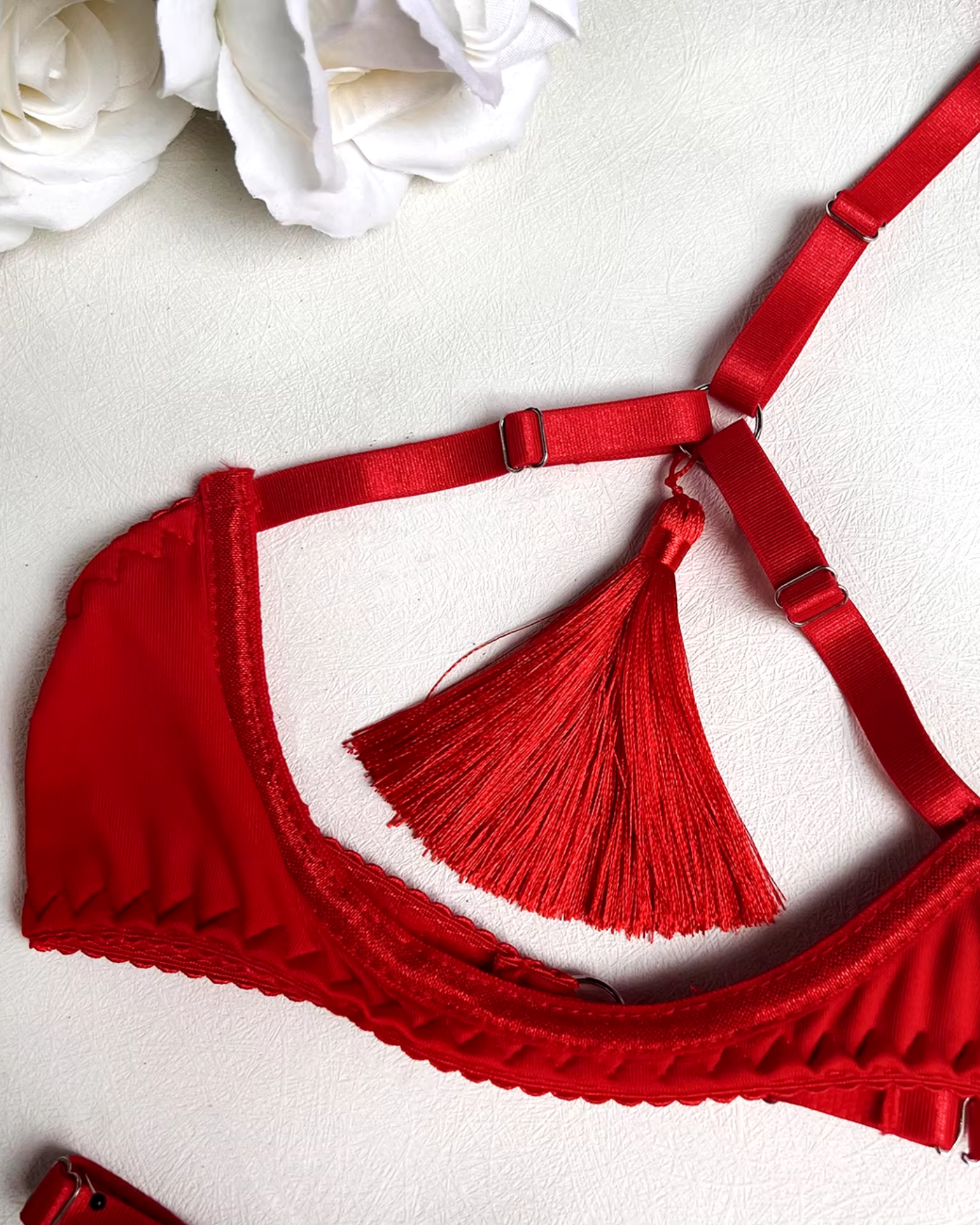 The bra features subtle tassels that gently fall over the nipples, along with adjustable straps, drawing attention and boldly showcasing the bust. The open design adds a touch of spice, making you feel alluring and confident.