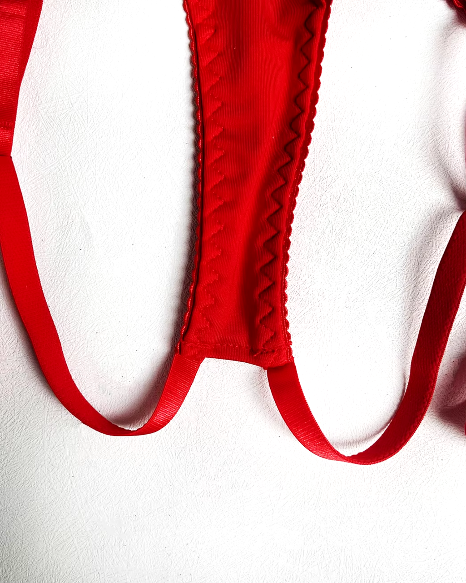 Enhance your lingerie collection with a sensual set that highlights your most beautiful assets. This unique ensemble consists of a daring bra, thong, and stylish thigh straps, creating the perfect combination of luxury and sensuality.