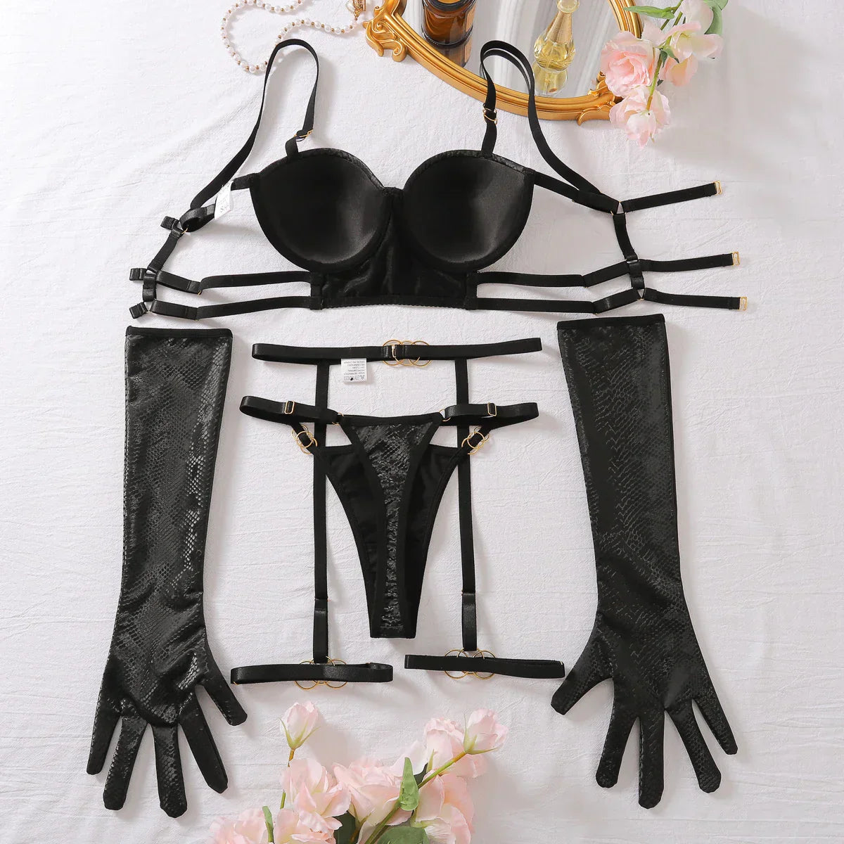 - Comprehensive set - Includes a bra, gloves, suspender belt, thong, and garters.