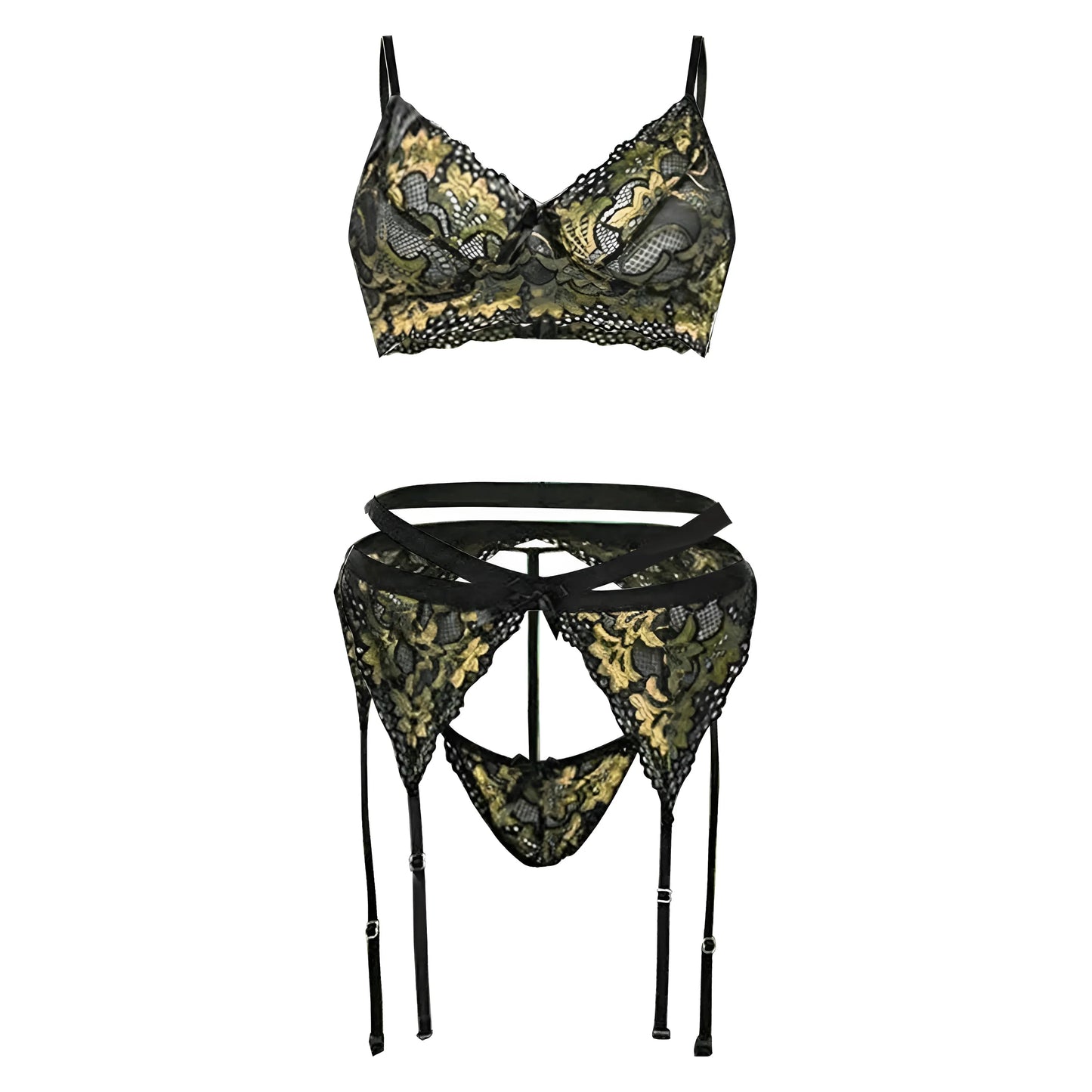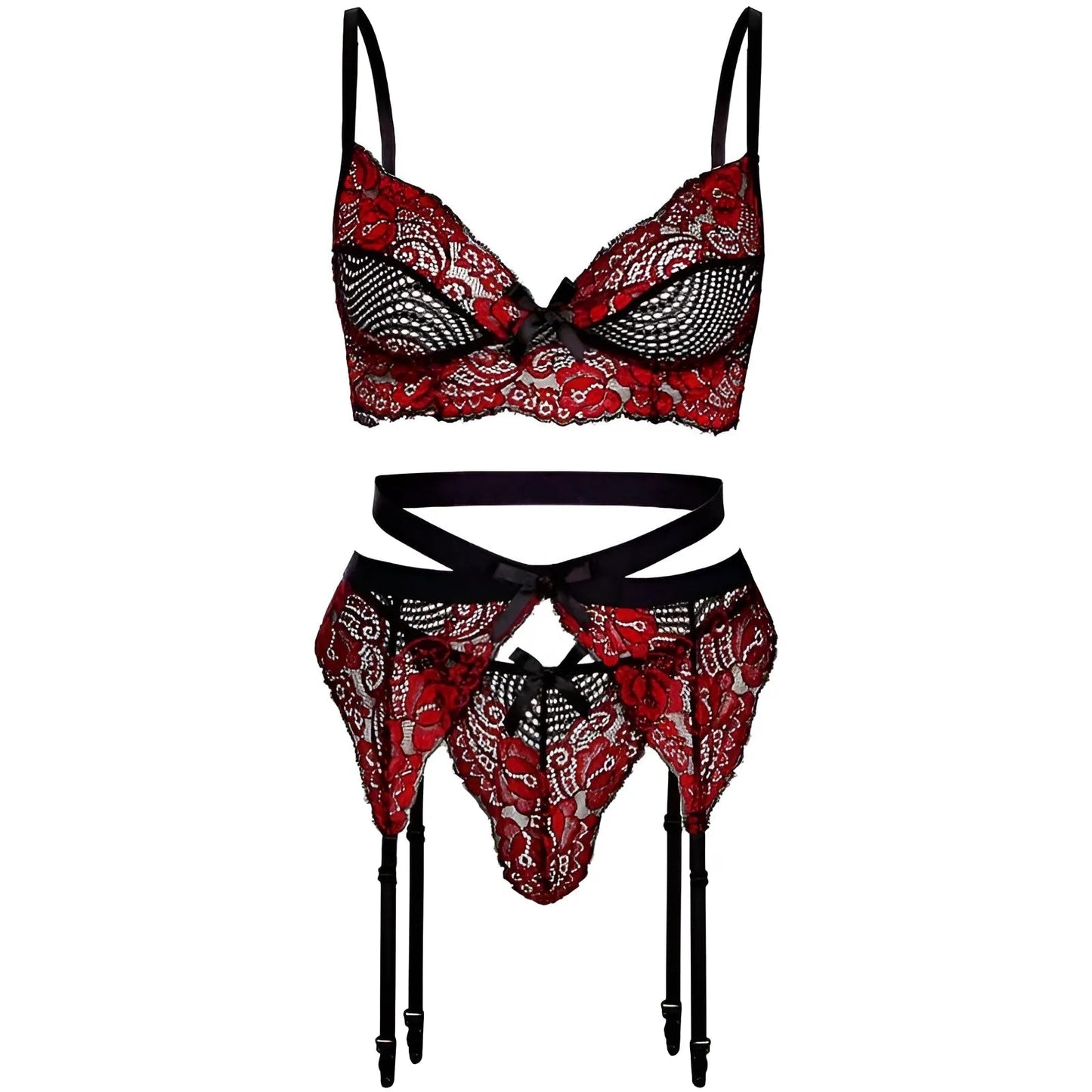 Unleash your inner goddess with our stunning lace set, featuring a bra, garter belt, and panties that embrace your curves. Choose from vibrant red, green, or blue to ignite your confidence and make every moment unforgettable!