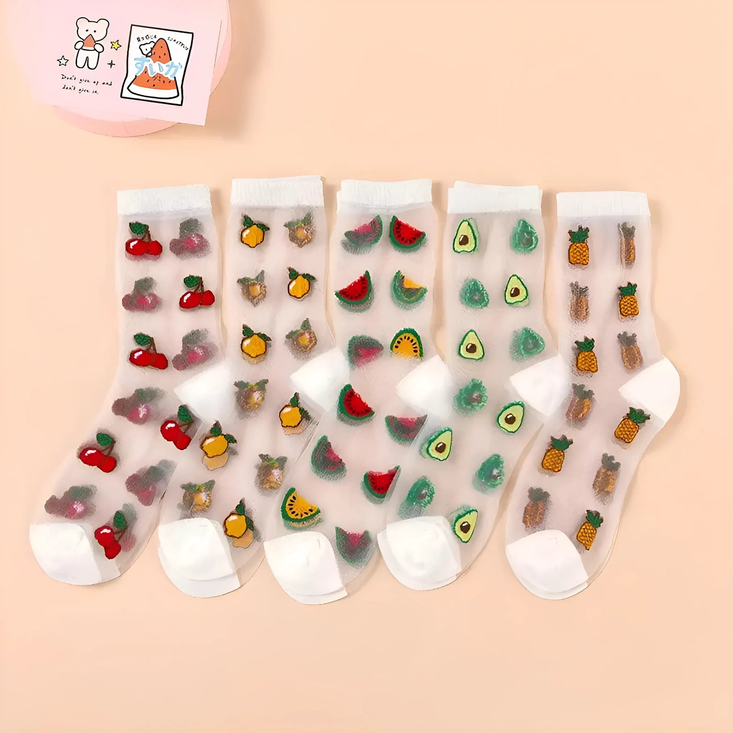 Step into a world of fun and freshness with our vibrant fruit-designed transparent socks—perfect for adding a playful touch to any outfit! Treat yourself to this delightful set of five and let your personality shine with every step you take.