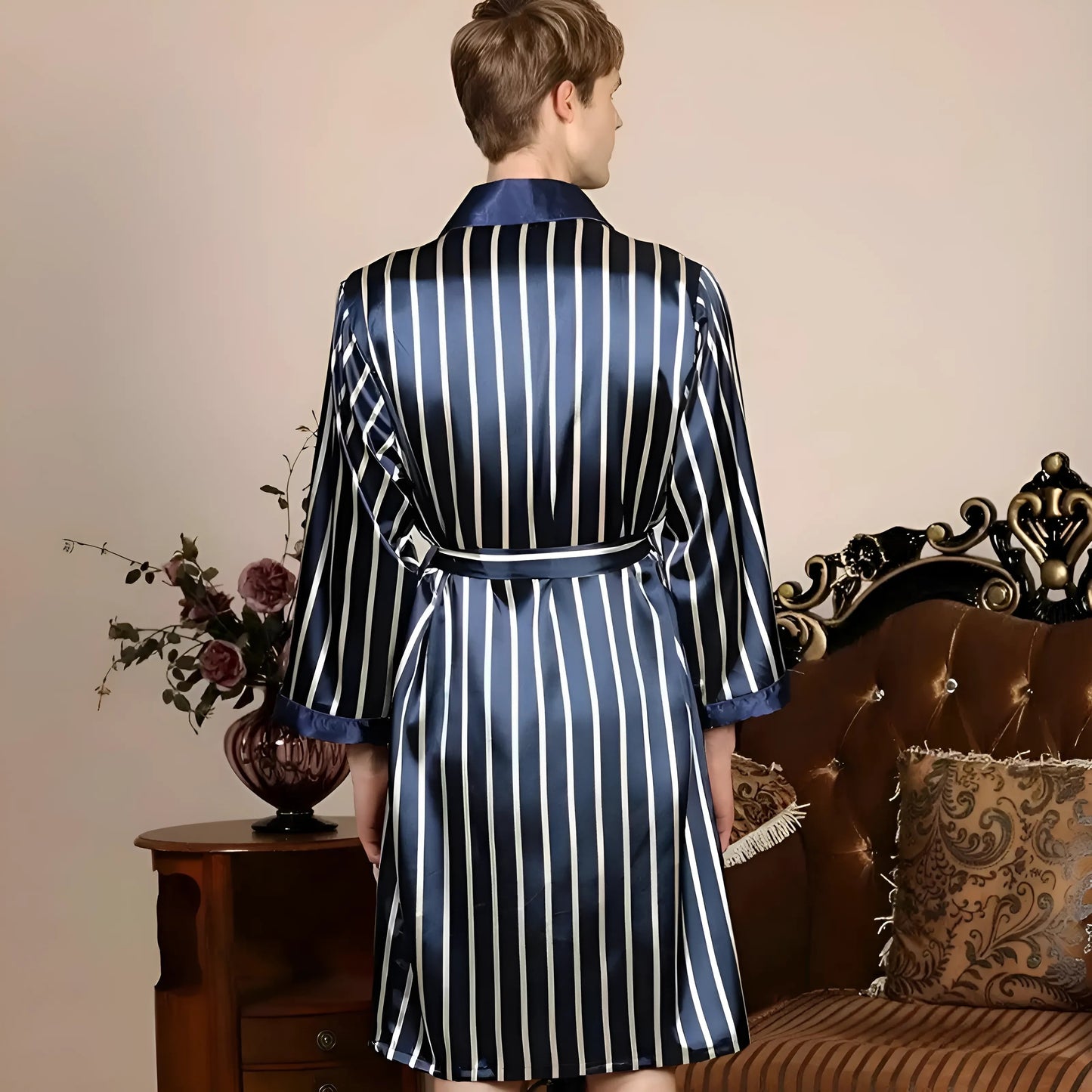 Elevate your wardrobe with our stunning blue and white striped satin dress, featuring a chic shawl collar and a flattering waist tie. Embrace effortless elegance and make every moment special—shop now and feel fabulous!