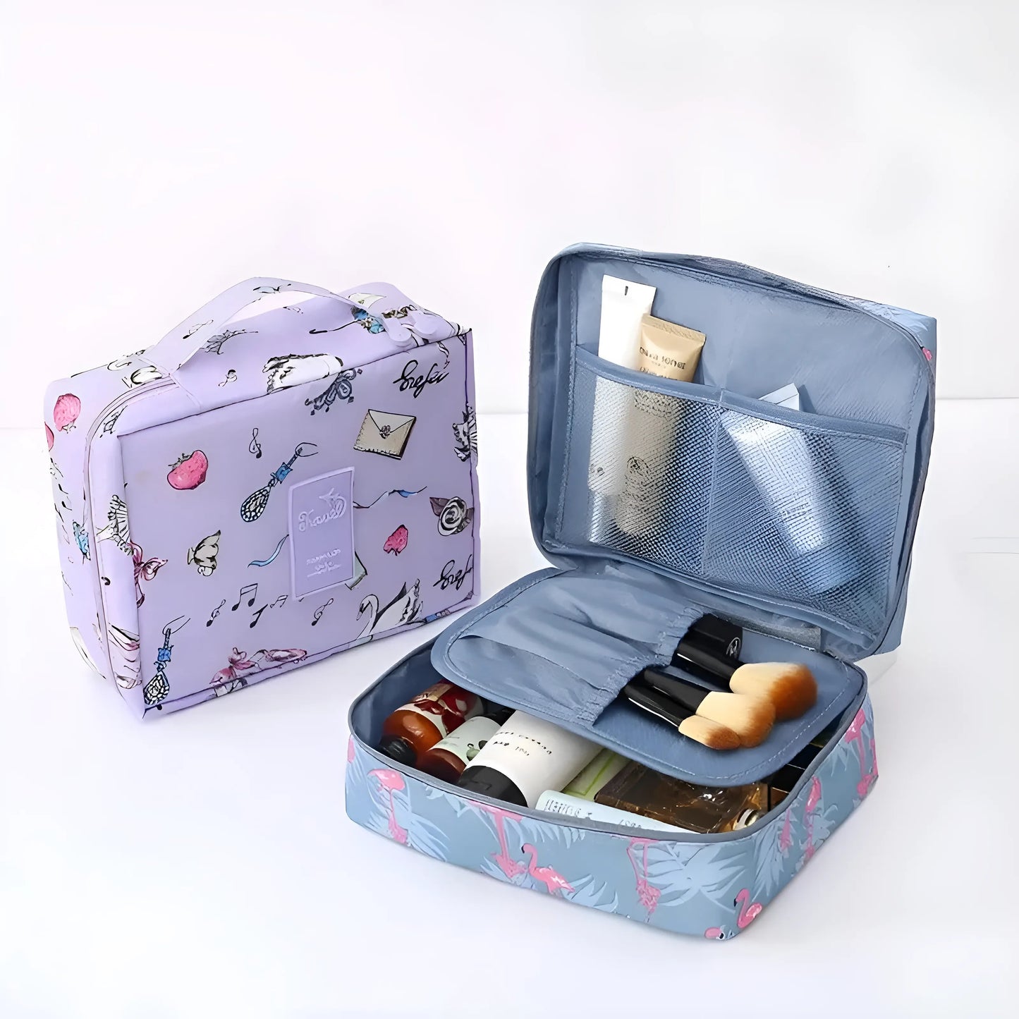 - Two cosmetic bags with different designs: one with a pattern and the other with a floral pattern.