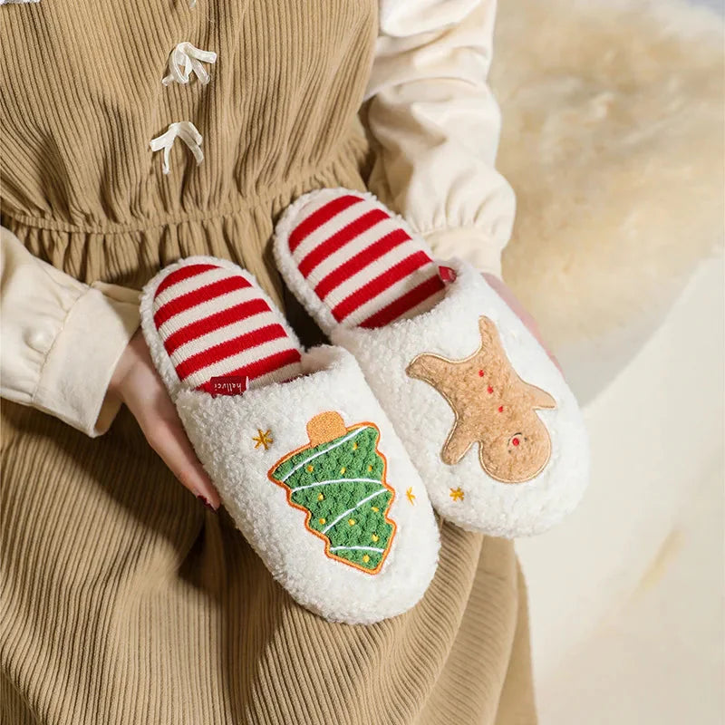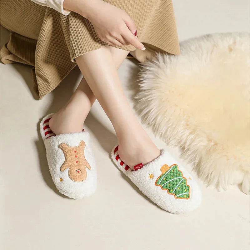 Immerse yourself in festive comfort with our fluffy women's slippers featuring a charming Christmas tree and gingerbread motif. These white slip-on slippers are not only perfect for everyday wear but will also add a touch of holiday magic to your home relaxation.