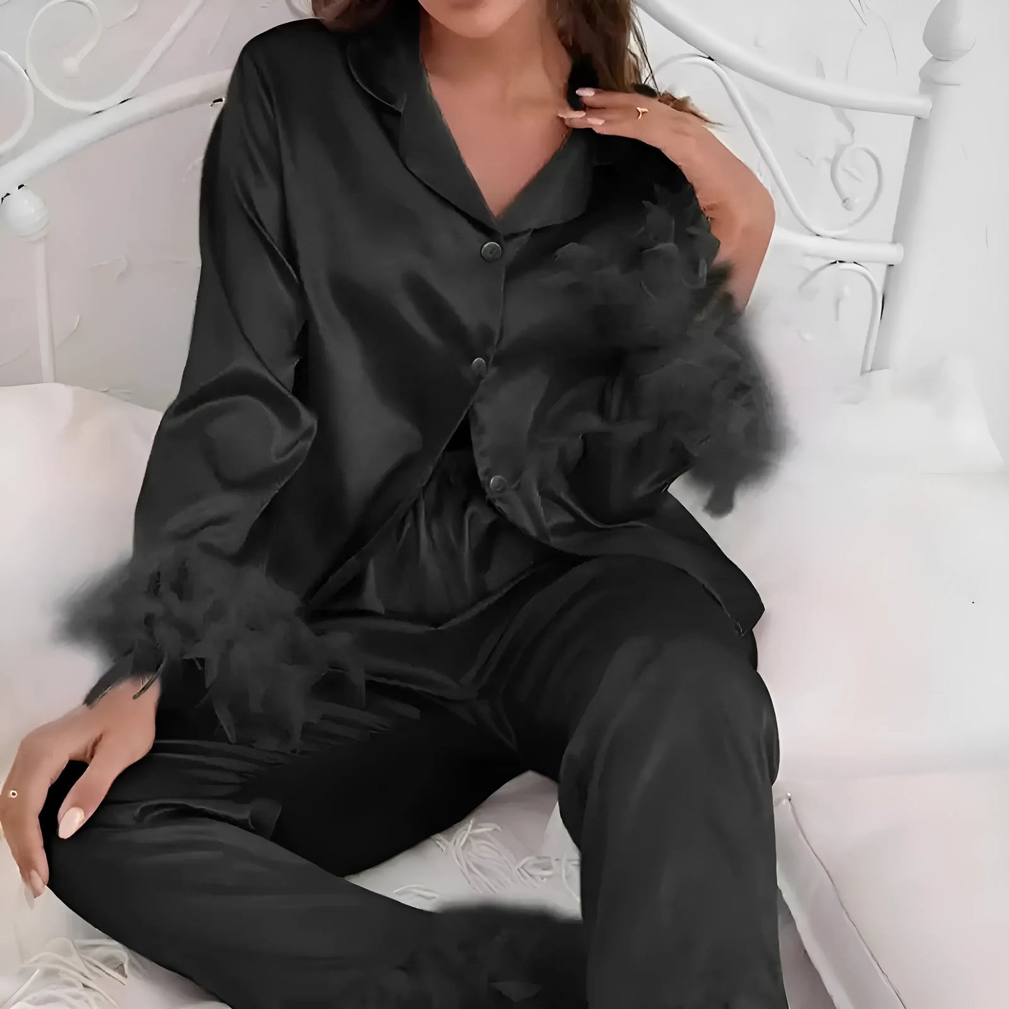 Indulge in the luxurious comfort of our satin button-up set, featuring elegant feather trim that adds a touch of glamour to your everyday style. Embrace your femininity and choose from classic black, soft pink, or pristine white—your perfect look awaits!