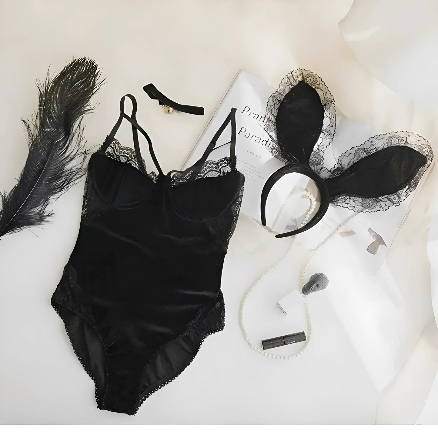 Unleash your inner allure with our stunning black lace bodysuit, featuring delicate strappy detailing and sheer fabric that beautifully accentuates your curves. Complete the look with elegant long black gloves and embrace the confidence that comes with feeling truly irresistible.