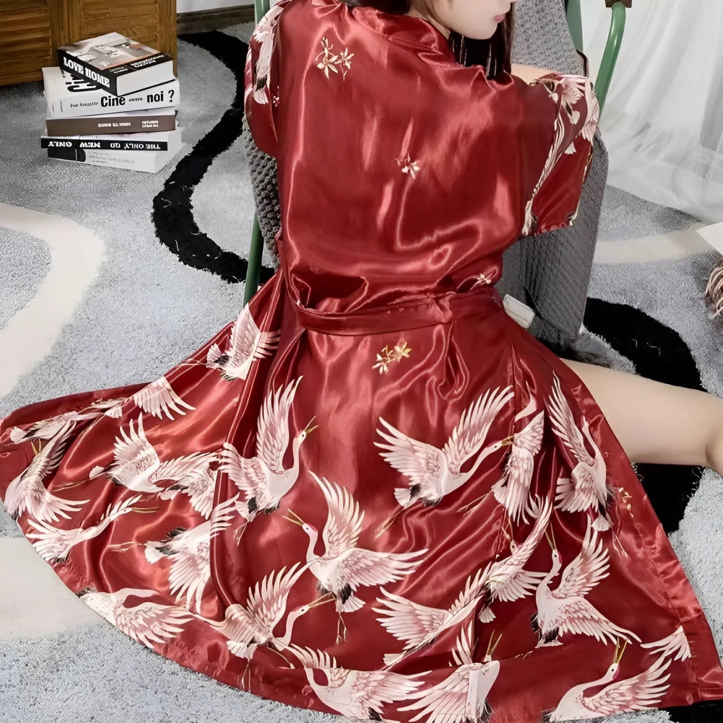 Elevate your style with our stunning satin dress, featuring a graceful crane bird print and delicate floral embroidery. Embrace your beauty and confidence—choose your favorite color and make a statement today!