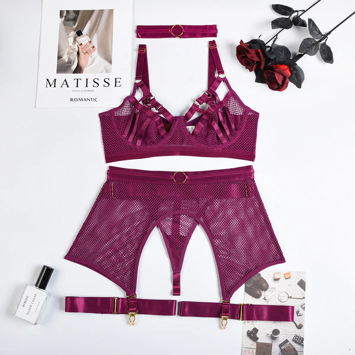- Multifunctional set - includes a bra, suspender belt, and garters, ideal for any occasion.