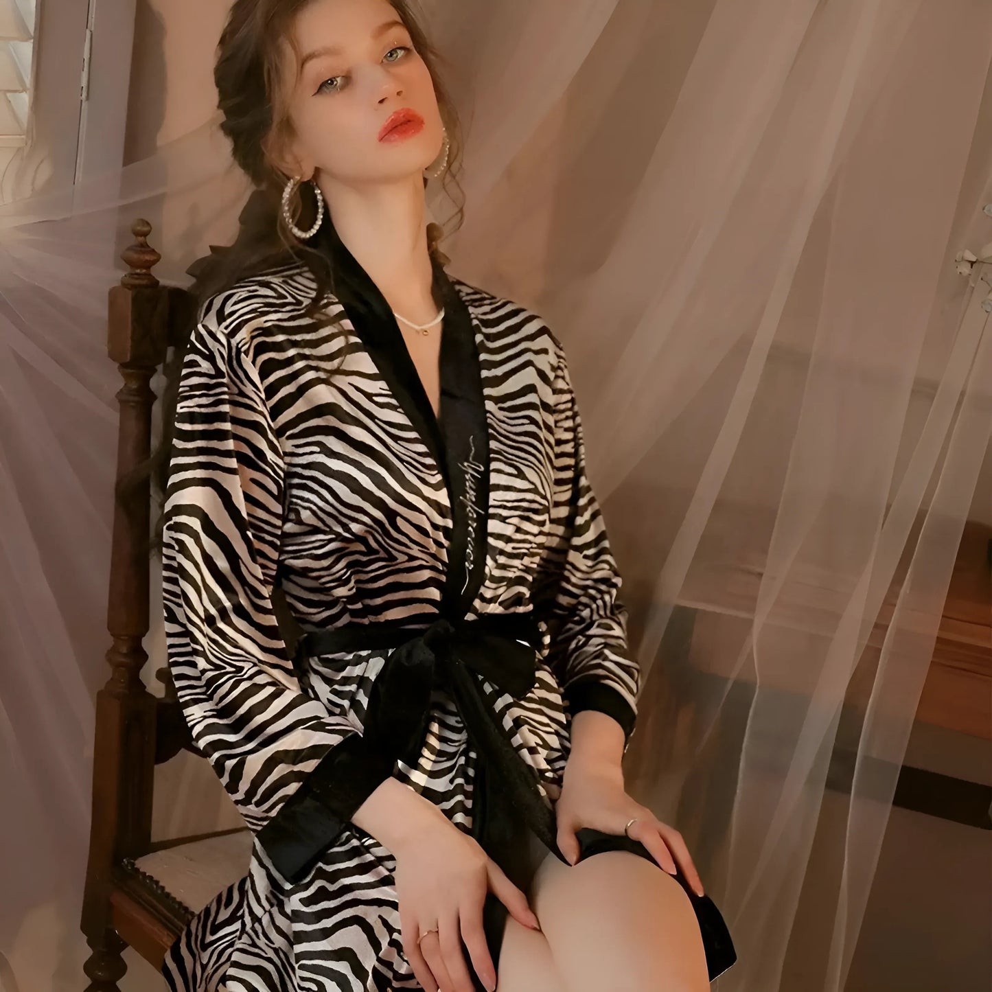 Embrace your wild side with our stunning zebra print design, crafted from luxurious satin and accented with chic black trim. Elevate your style and confidence with the perfect waist tie belt—shop now and make a statement!