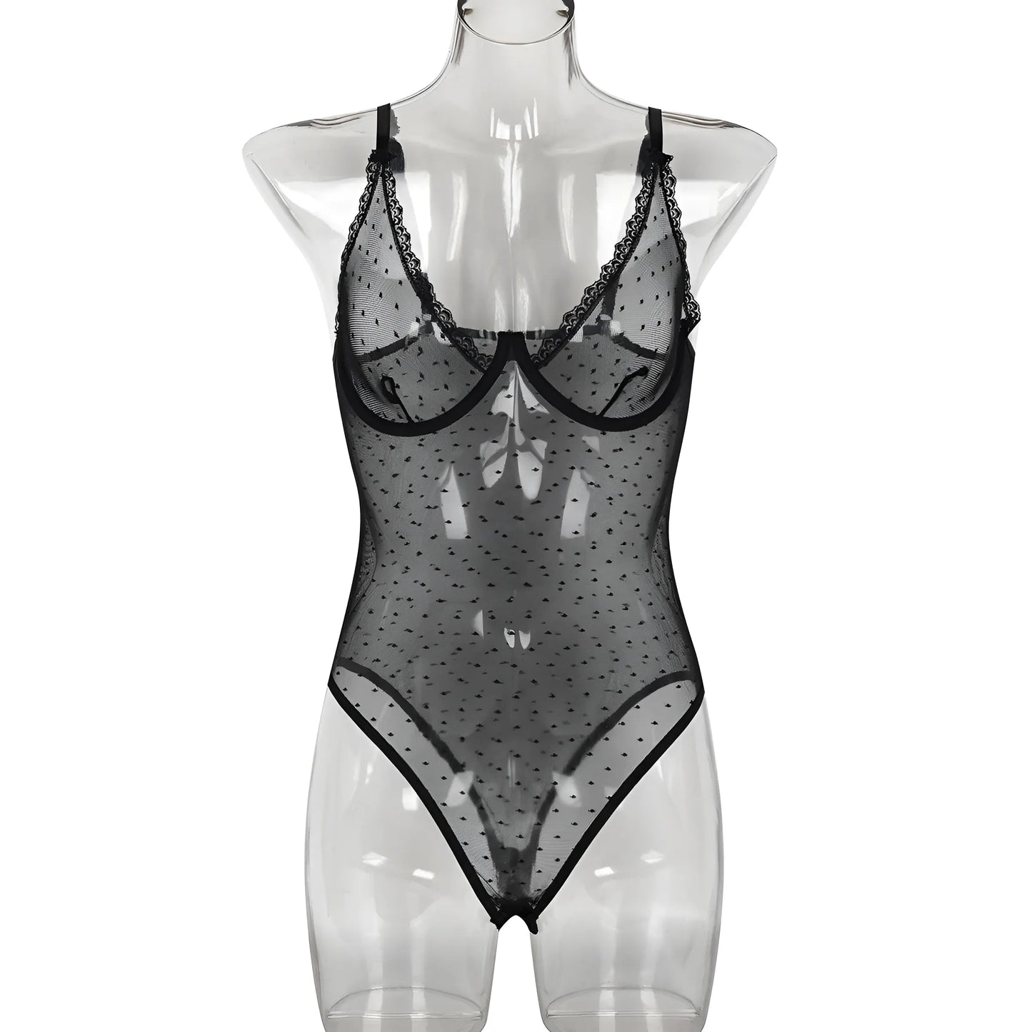 Unleash your inner allure with our stunning sheer black lace piece, featuring a captivating deep neckline and playful polka dot pattern. Complete your look with matching lace gloves and ribbon ties—embrace elegance and make every moment unforgettable!