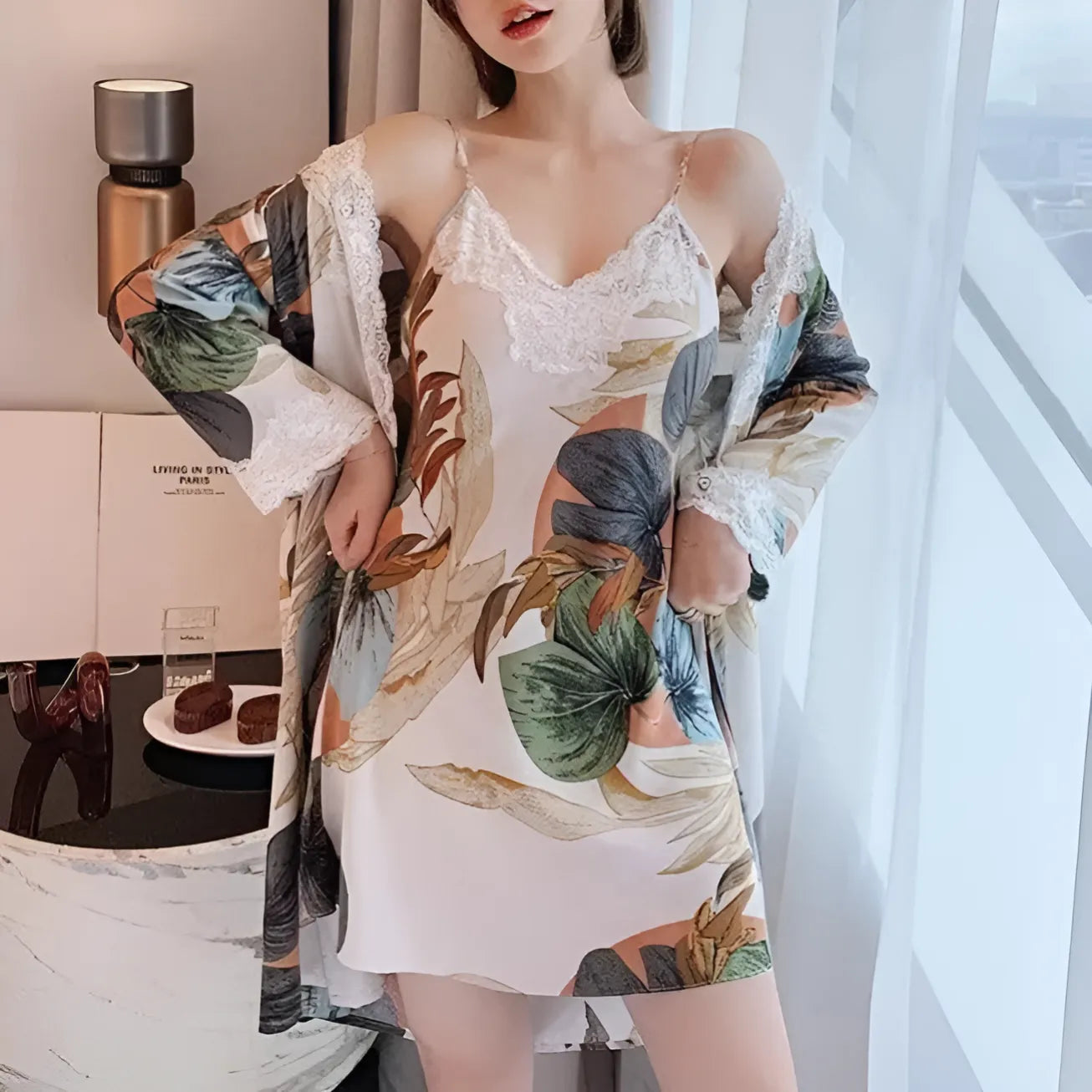 Indulge in the ultimate comfort and elegance with our two-piece sleepwear set, featuring a stunning floral and leaf pattern adorned with delicate lace trim. Treat yourself to the luxurious feel of lightweight, silky fabric in your choice of Beige, Black, or White—because you deserve to feel beautiful even in your downtime!