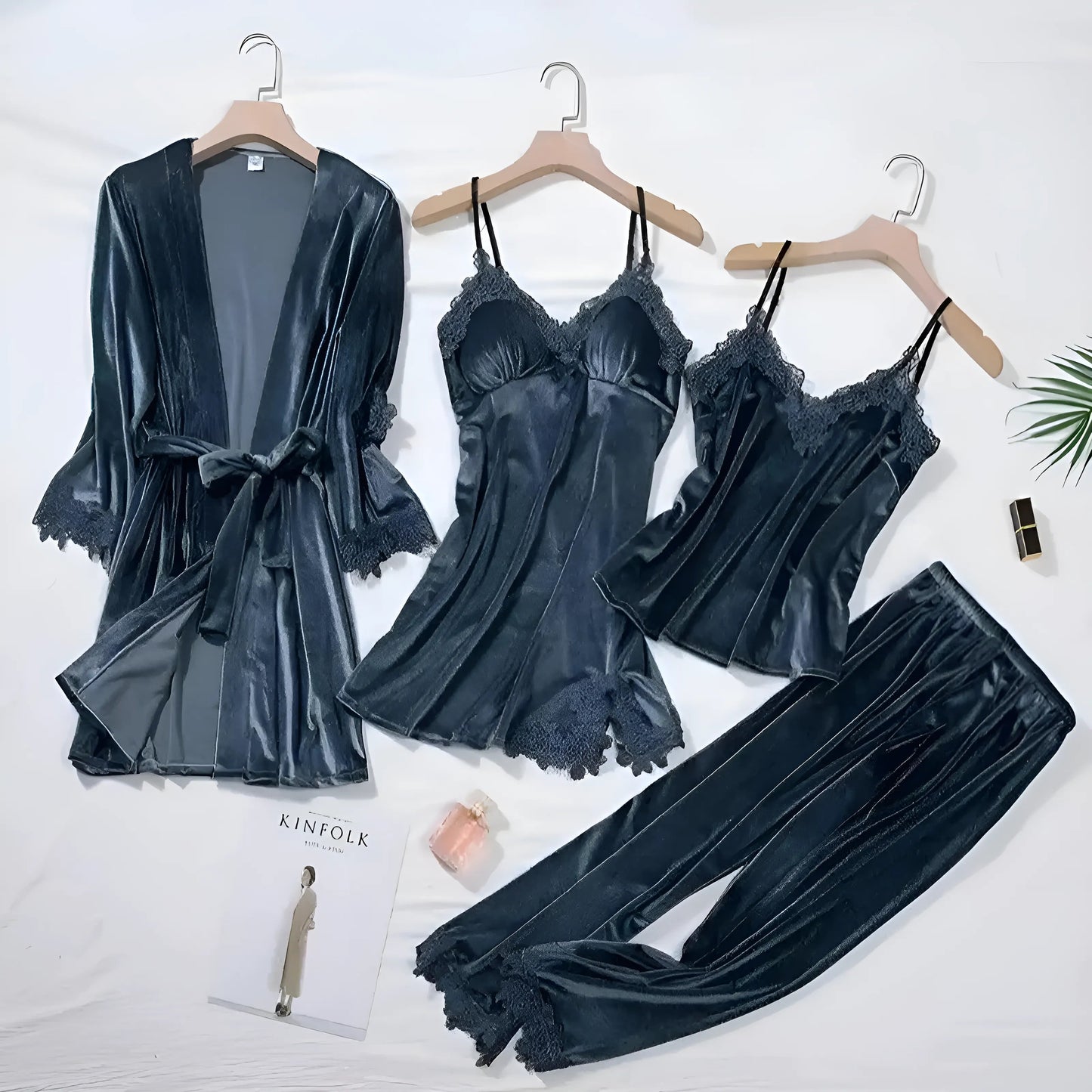 Indulge in luxury with our elegant coordinated set, featuring rich velvet fabric and delicate lace trim that will make you feel beautiful and confident. Choose your favorite color—Burgundy, Navy Blue, Grey, or Pink—and elevate your loungewear collection today!