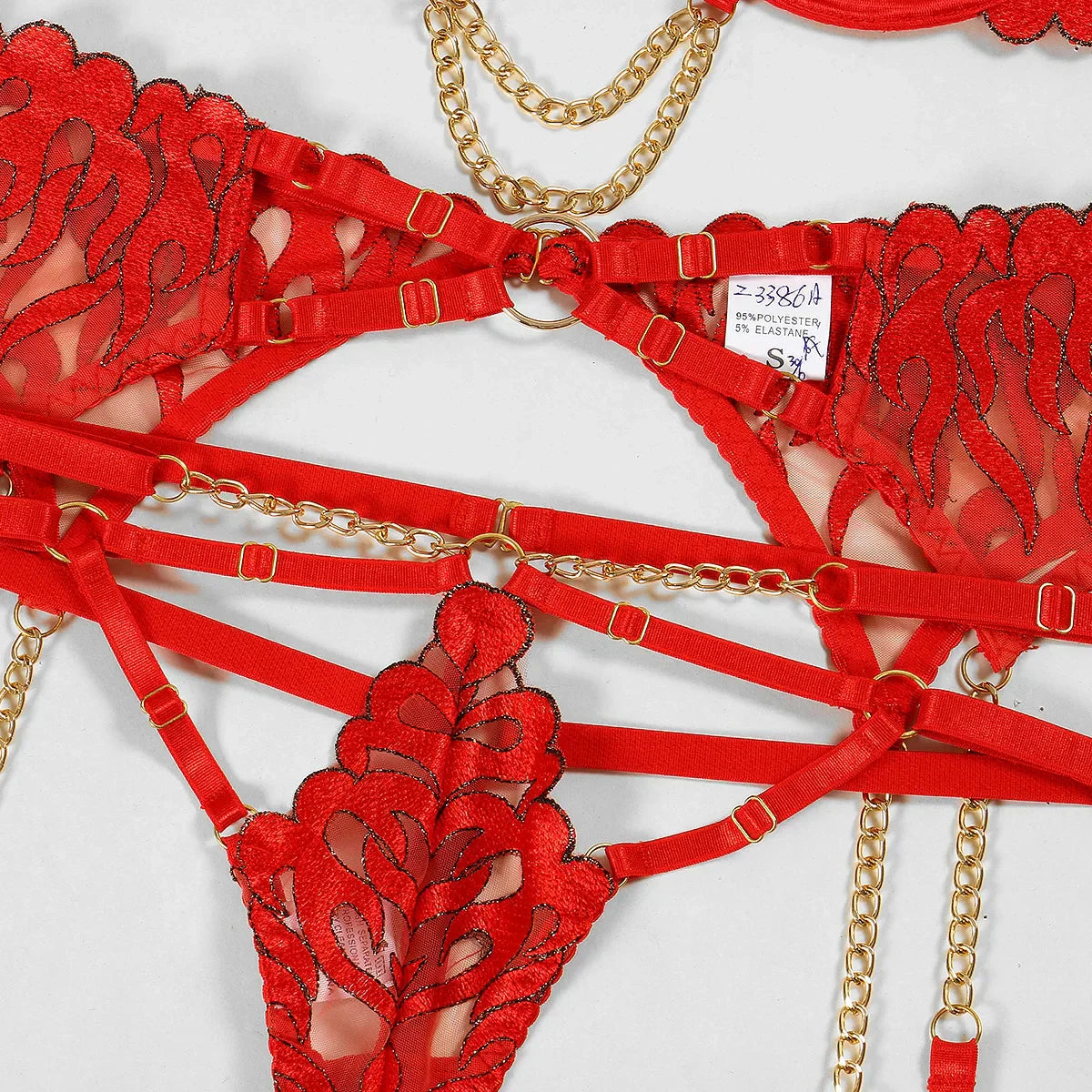 - Comprehensive set - includes a bra, suspender belt, thong, and garters.